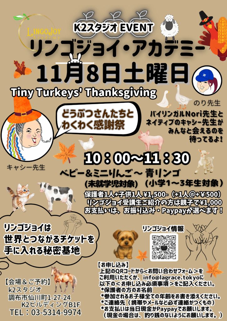 11月8日(土)10:00~11:30: Tiny Turkey’s Thanksgiving 楽しい感謝祭🎵