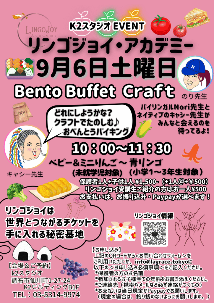 9月6日(土) 10:00~11:30: What’s in your lunch box? 食べ物について、英語で楽しく遊ぼう!