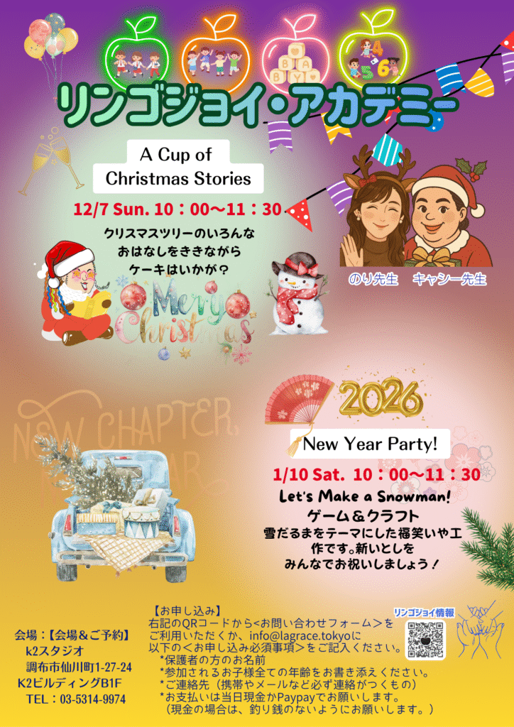 2024年12月8日(日)蘆花恒春園 花の丘13:00~16:30『こどものクリスマスパーティー』 にて、リンゴジョイ・アカデミー(14:25~14:45予定)は、”Songs from the Winterland”と題し、みんなが知っている映画から英語の歌と、英語が学べるアクティビティを予定しています。