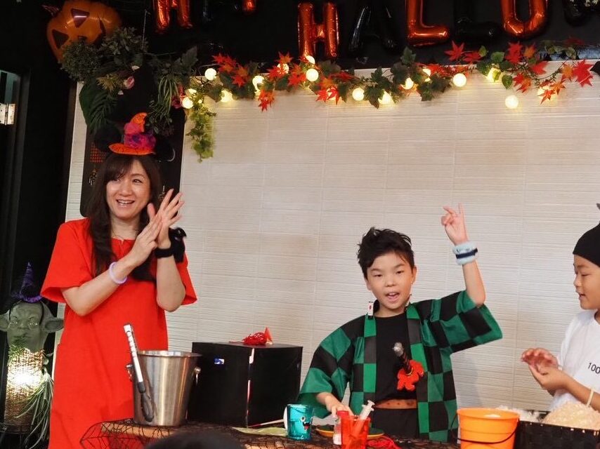 2024年10月17日(木)仙川K2スタジオにて合同キッズクラスHalloweenイベントを実施!青リンゴクラス4年生は、魔法の実験で、幼児クラスの生徒さんたちにプレゼンテーション🎵